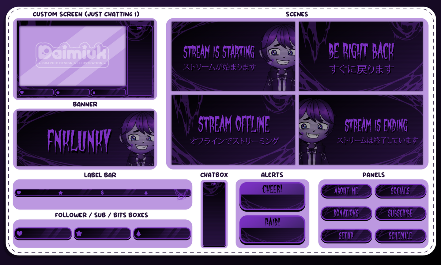 Hola! Soy Daimiuk, una diseñadora gráfica e ilustradora argentina. Si sos streamer y estas buscando un diseño de twitch copado, llegaste al lugar correcto ( ͡° ͜ʖ ͡°)Mas abajo vas a encontrar diferentes packs personalizados según lo que estés buscando y todo lo que necesitas saber antes de pedir uno. En todos los packs el diseño de tu stream va a ser único y personalizado como a vos mas te guste :) Pero tambíen hay templates en caso de que te interese alguno de los diseños previamente subidos.Para pedir un pack o template podes enviarme un mail a [email protected] o un MD por instagram
